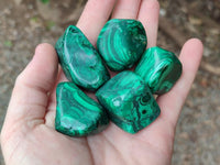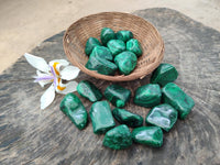 A Tray of 26 Individually Made Malachite Free Forms With Flower and Banding Patterns.