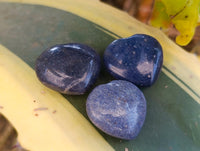 Lazulite is a blue mineral known for its vibrant color and unique properties. It crystallizes in the monoclinic system, although the material sourced from Madagascar comes from a massive non-crystalline deposit. This stone displays a range of color intensities, from lighter blue with occasional banding to deeper, solid blue hues, providing a captivating visual appeal. The material often contains minor inclusions that resemble specular ash flakes, adding to its distinctiveness.