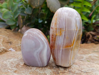 A tray of 8 Polished Banded Shashe River Agate Standing Display Pieces x 2 and Free Forms x 6.