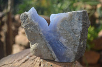 Blue Lace Agate, meticulously sourced from the mines of Nsanje, Malawi. The deposits yield a dynamic mix of blue to white chalcedony, occasionally forming mesmerizing banded patterns, and showcasing crystalline geode-like or intricate vug specimens. The lapidary work is where the magic truly happens, revealing lovely crystalline exposures and intricate shapes that enhance the natural beauty of this stone. Renowned for its captivating blend of banded white to blue colours, this polished Blue Lace Agate becomes a perennial favourite among collectors and enthusiasts. A select few specimens may even surprise with the inclusion of Dog Tooth Calcite crystals within the geodes, adding an extra layer of fascination. Every piece is carefully chosen and cleaned, ensuring the highest quality for discerning collectors. Shiny crystals within the vugs and on the plates, along with occasional clear drusy-like coatings, contribute to the stone's popularity. Price is grade dependant. Items are as shown.Product Data