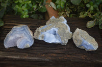 Blue Lace Agate, meticulously sourced from the mines of Nsanje, Malawi. This extraordinary material undergoes a captivating transformation through the hands of skilled lapidary artisans in South Africa, led by the talented Gary and his dedicated team. The deposits yield a dynamic mix of blue to white chalcedony, occasionally forming mesmerizing banded patterns, and showcasing crystalline geode-like or intricate vug specimens. The lapidary work is where the magic truly happens, revealing lovely crystalline exposures and intricate shapes that enhance the natural beauty of this stone. Renowned for its captivating blend of banded white to blue colors, this polished Blue Lace Agate becomes a perennial favorite among collectors and enthusiasts. A select few specimens may even surprise with the inclusion of Dog Tooth Calcite crystals within the geodes, adding an extra layer of fascination. Every piece is carefully chosen and cleaned, ensuring the highest quality for discerning collectors. Shiny crystals within the vugs and on the plates, along with occasional clear drusy-like coatings, contribute to the stone's popularity. Price is grade dependant. Items are as shown.Product Data