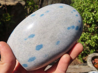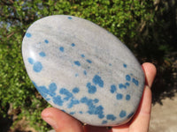 Often called Blue Dalmatian Stone! This is a fairly new material from Madagascar which is almost brecciated Quartz / Granite-like matrix which ranges in colour from white to smokey. A percentage of the material with a Quartz matrix has variable gemmy zones with a wide range of blue Spinel spot-like inclusions. The more recent material is closer in appearance to the K2 Afghanite. A very interesting new product line which has up to now only been available in hearts, spheres and most recently standing free forms. Excellent polished finish. Very nice rare new material which has sometimes been called blue Dalmatian Jasper. It has been recently reported that the President of Madagascar has purchased the mine producing this material. Last time this happened, the material exited the market, as in terms of Malagasy law, only the mine owner can sign the paperwork for export. Therefore, it is likely this material will become extremely rare in the very near future. Price is grade dependant. Item/s are as shown.Product Data