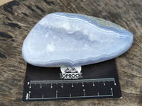 Blue Lace Agate from Nsanje, Malawi is a beautiful sought after variety of Chalcedony with its light blue hues and intricate banding patterns. Characterized by soft, flowing lines and wavy designs. Very rarely there's Dog Tooth Calcite in the Geode Centred Vugs that is Fluorescent!