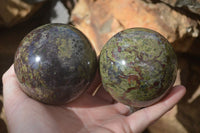 Bastite (Epidote and Piedmontite) specimens sourced from Tshipise, named for its thermal hot springs. The rich combination of green, red, and earthy hues presents an exquisite colour mix reminiscent of Dragons Blood Stone. These specimens, often referred to as Dragons Blood Stone due to their striking appearance, showcase a captivating blend of colours unique to this region. Bastite, a combination of Epidote and Piedmontite, reflects the geological complexity and rarity of this material. Piedmontite, a member of the Epidote group, displays hues ranging from red to reddish-brown or red-black, exhibiting a vitreous lustre and a red streak. Epidote, while abundantly found in metamorphic rocks like Marble and Schistose formations, is an outcome of hydrothermal alterations in various igneous rocks. This exclusive material from Tshipise is not commonly available, especially in its polished form, making these specimens truly exceptional. Price is grade dependant. Items are as shown.Product Data