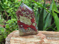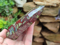 4 nice Bastite polished points with green Epidote and red Hematite.