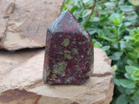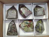 Dragons Blood Stone Bastite, a rare material sourced from Tshipise, renowned for its thermal hot springs. This exceptional collection features a captivating blend of green, red, and earthy hues, reminiscent of Dragons Bloodstone. Bastite is a combination of Epidote and Piemontite, showcasing the geological complexity and rarity of this material. Piemontite, a member of the Epidote group. Epidote, often found in metamorphic rocks like Marble and Schistose formations, results from hydrothermal alterations in various igneous rocks.