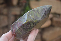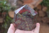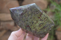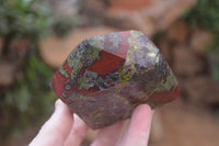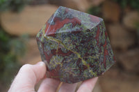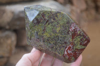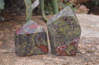 Dragons Blood Stone Bastite, a rare and striking material sourced from Tshipise, renowned for its thermal hot springs. This exceptional collection features a captivating blend of green, red, and earthy hues, reminiscent of Dragons Bloodstone.