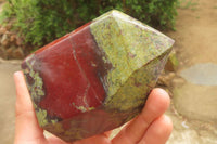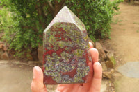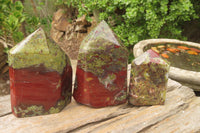 Dragons Blood Stone Bastite, a rare and striking material sourced from Tshipise, renowned for its thermal hot springs. This exceptional collection features a captivating blend of green, red, and earthy hues, reminiscent of Dragons Bloodstone.