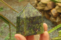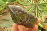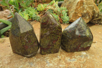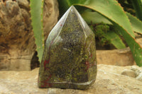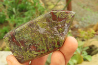Dragons Blood Stone Bastite, a rare and striking material sourced from Tshipise, renowned for its thermal hot springs. This exceptional collection features a captivating blend of green, red, and earthy hues, reminiscent of Dragons Bloodstone.