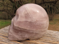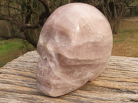 Hand Carved Rose Quartz Skull With Rainbow Inclusions.