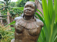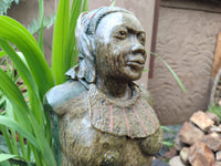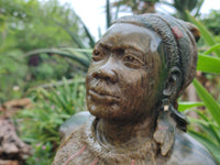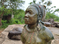 This stunning traditional African woman bust sculpture is a masterful work of art, intricately handcrafted from Green Verdite and Onyx, sourced from the heart of Zimbabwe. The sculpture showcases the elegance and strength of African heritage, with the smooth, natural textures of the stones enhancing its beauty. Carved using a diamond tool but with careful attention to traditional handcrafting techniques, each piece is unique, reflecting the artist’s skill and deep cultural appreciation.