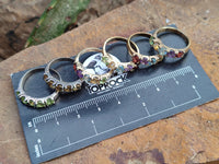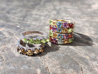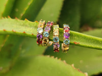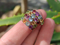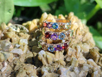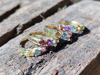 9-carat gold-plated rings, freshly stocked from Southern Africa, each adorned with five vibrant faceted gemstones: Garnet, Peridot, Citrine, Amethyst, and Aquamarine. These handcrafted rings showcase a dazzling array of colors, set in a variety of ring sizes to suit every style. Perfect for adding a touch of elegance and natural beauty to any occasion.