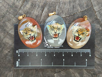 Cute Polished Oval Polychrome Jasper Pendant with Hand Painted Leopard