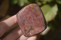 Rhodonite, a member of the pyroxenoid group of minerals, is a captivating manganese inosilicate, with a chemical composition of SiO₃. Its crystalline structure follows the triclinic system. Typically, Rhodonite is found in cleavable to compact masses and is characterized by its stunning rose-red colour. Presenting a new deposit of Rhodonite, recently unearthed in Zimbabwe and expertly polished in the same region. This material boasts a remarkably rare and enchanting rich pink to deep red hue. It often occurs alongside black Chromite and possesses an impressive weight-to-size ratio. The pink coloration can vary from a dusky pink to semi-gemmy, an exceptionally rare feature. Rhodonite is an exceptionally hard stone, and each piece is meticulously polished to bring out its natural beauty. Pricing varies according to the grade, and the items are showcased as displayed. Intriguingly, the name Rhodonite finds its origin in the Greek word "rhodos," which means "rose," a fitting reference to the stone's distinctive pink or rose-red colour. The discovery of banded Rhodonite in Argentina during the 1930s catapulted it into popularity as an ornamental stone, sometimes referred to as "Inca Rose" in reference to the regional material. Price is grade dependant. Items are as shown.Product Data