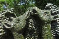 Handcrafted Green Verdite carving of embracing giraffes on a wooden base