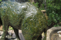 The material has been given various common names over the past few decades and has been commonly used in Zimbabwe Shona carvings for many decades. The colours of the green are variable across pieces, with often swirling or banded complex patterns due to the colour intensity changes across pieces.