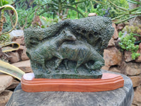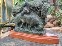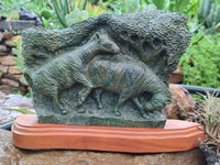Green Verdite carving of two zebra under a tree on a wooden display stand
